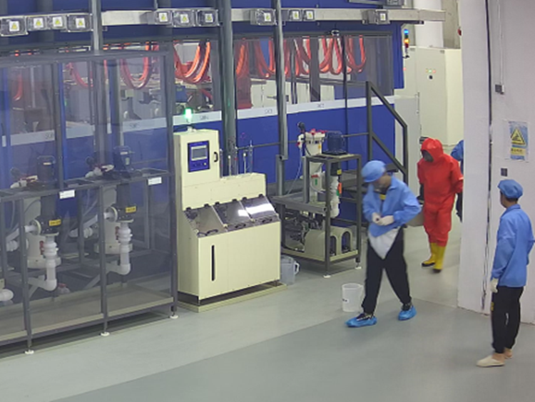 背景作業(yè)人員往鈀金平臺倒入藥水時(shí)需要穿戴防護(hù)圍裙、面罩、穿戴手套。對未按照要求作業(yè)的進(jìn)行識別并做出警示。避免化學(xué)藥水對作業(yè)人員造成不必要的傷害。